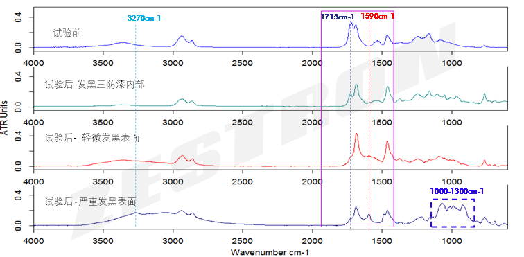 通过系列分析,AGGAME R&S团队发现,在试验条件下,涂覆层吸收潮湿使其所含物质发生水解; 水解后电导率上升,提供了腐蚀性的内部环境条件;在电场作用下,导致铜线路发生电化学腐蚀,腐蚀产物可能起到了荧光淬灭作用,导致涂覆层严重发黑,且失去或减少荧光效应。