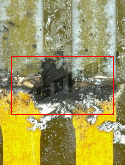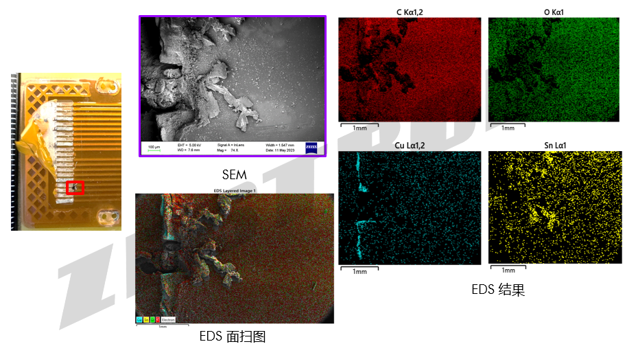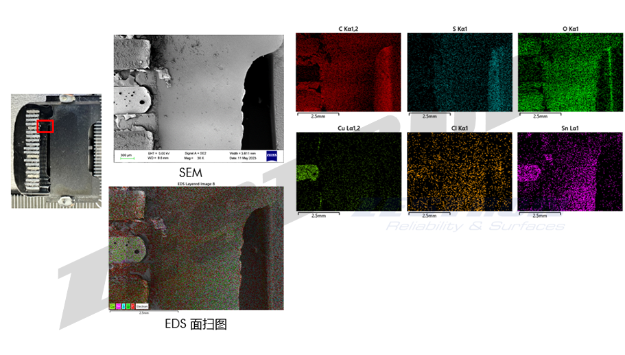 失效分析案例 | FPCA连接器高压绝缘失效 失效分析案例 | FPCA连接器高压绝缘失效 一、背景介绍 某FPCA连接器在盐雾测试后进行500V高压测试时出现打火烧毁现象,AGGAME R&S接收到委托,帮助分析打火失效成因。 二、失效分析过程 1、样品外观目检 结构完整,无明显异常。 2.在光学显微镜下观察失效区域 3、在光学显微镜下观察保护胶表面压痕情况(连接器侧) 4、使用SEM&EDS分析失效区域 以上为部分分析结果展示 三、结论 AGGAME R&S通过综合分析手段,发现烧毁区域FPC侧周边的成分主要为C/O/Sn,连接器侧烧毁点周边的成分主要为C/O/Sn/Cl。根据R&S累积多年的成功经验,分析打火失效的成因为FPC焊接面与保护胶结合强度不足,湿气/盐雾侵入后导致焊点被腐蚀,引脚间绝缘电阻下降,最终在耐压测试时导致打火烧毁。 风险防范 FPCA连接器的质检中应充分评价保护胶与FPC的结合力,预防FPC与保护胶之间出现微缝隙或分层等不良。 如您对清洗工艺或提高电子可靠性存在疑问,欢迎与我们取得联系! 您也可以预约免费清洗测试,在AGGAME技术中心的多种设备上对您的产品进行试洗。 立即咨询